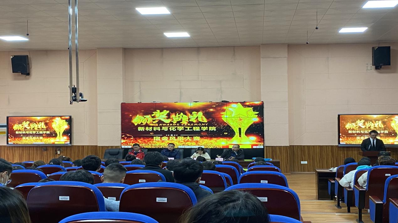 2021年12月7日中午13:10分,太阳集团tcy8722在明德楼紫金厅举办了第一届宿舍风采大赛颁奖典礼暨全院学生工作会,学院全体学生、学院党总支书记卢德炳、办公室主任吴珣、学生管理科科长唐梓峻、辅导员陈国强参加会议。