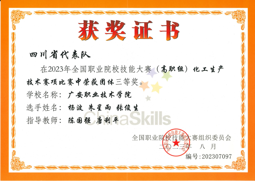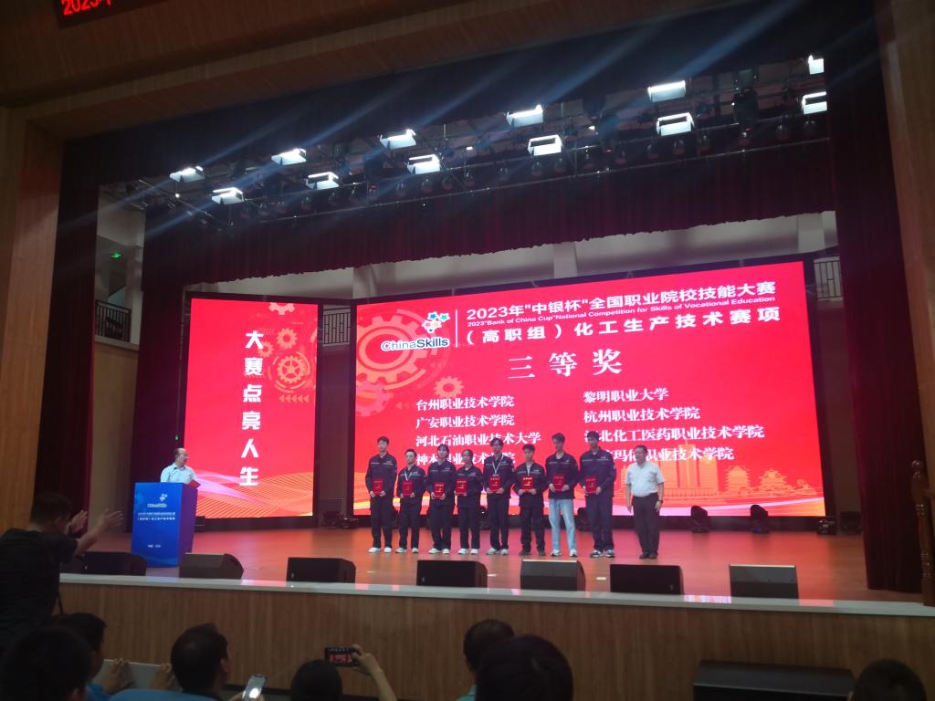 8月18日至8月22日,2023年全国职业院校技能大赛“化工生产技术”赛项在兰州石化职业技术大学举行。我院陈国强、唐利平老师指导的应用化工技术专业张俊生、杨波、朱星雨三位同学参加比赛,经过四天的激烈角逐,荣获国赛三等奖,实现了该赛项的新突破。