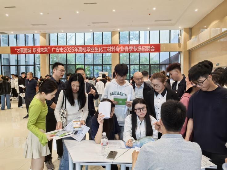 为深入贯彻党的二十大精神,切实做好学院2025届未就业、2026届毕业生就业工作,促进毕业生高质量就业,4月29日,由广安市人力资源与社会保障局、广安职业技术学院、广安经开区市域产教联合体共同主办的“才聚賨城 职引未来”广安市2025年高校毕业生化工材料专业春季专场招聘会在格致楼一楼举行。招聘会由太阳集团tcy8722、招生就业处共同承办,共邀请了省内外19家规上企业参加,提供化工材料领域就业岗位420个。学院部分2025届未就业学生、2026届全体毕业生参加,现场气氛热烈。
