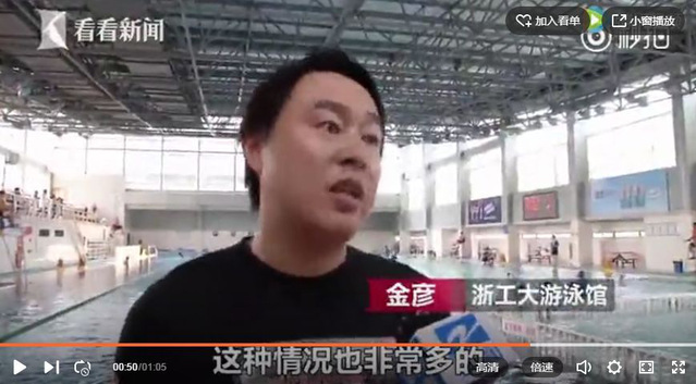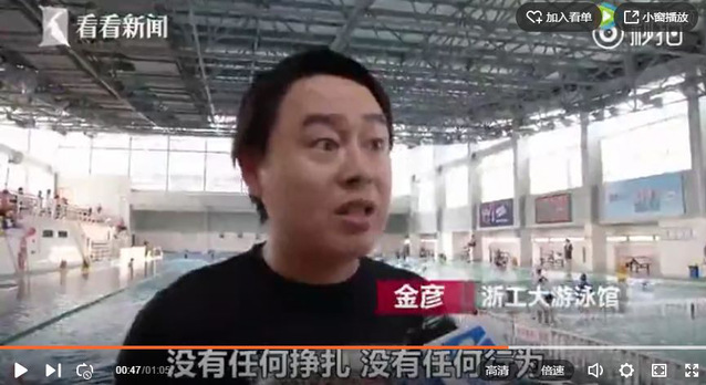 在周边人看来,处于溺水状态的孩子,并没有什么异常。他们会站立,头微微仰着,双手在水里划动,就像在潜水玩一样。游泳教练金彦说:“对没有概念的人来说,可能就是想他到底在干嘛,没有任何挣扎,没有任何行为,这种情况也非常多的,并不是大家印象里面挣扎呼救。”孩子溺水的真正状态,就是不会呈现什么异常状态。
