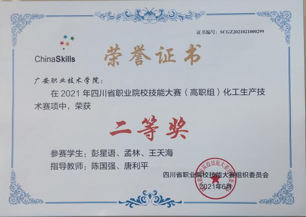 学院学风浓厚,学生善思笃行。学生参加国家级、省级技能大赛和创新创业比赛,获得国家级一等奖2项、省级二等奖3项、三等奖1项,两次代表四川省参加全国职业院校化工生产技术技能大赛。获得“发明杯”大学生创新创业大赛二等奖2项、三等奖3项,“互联网+”大学生创新创业大赛省级银奖1项、铜奖1项。