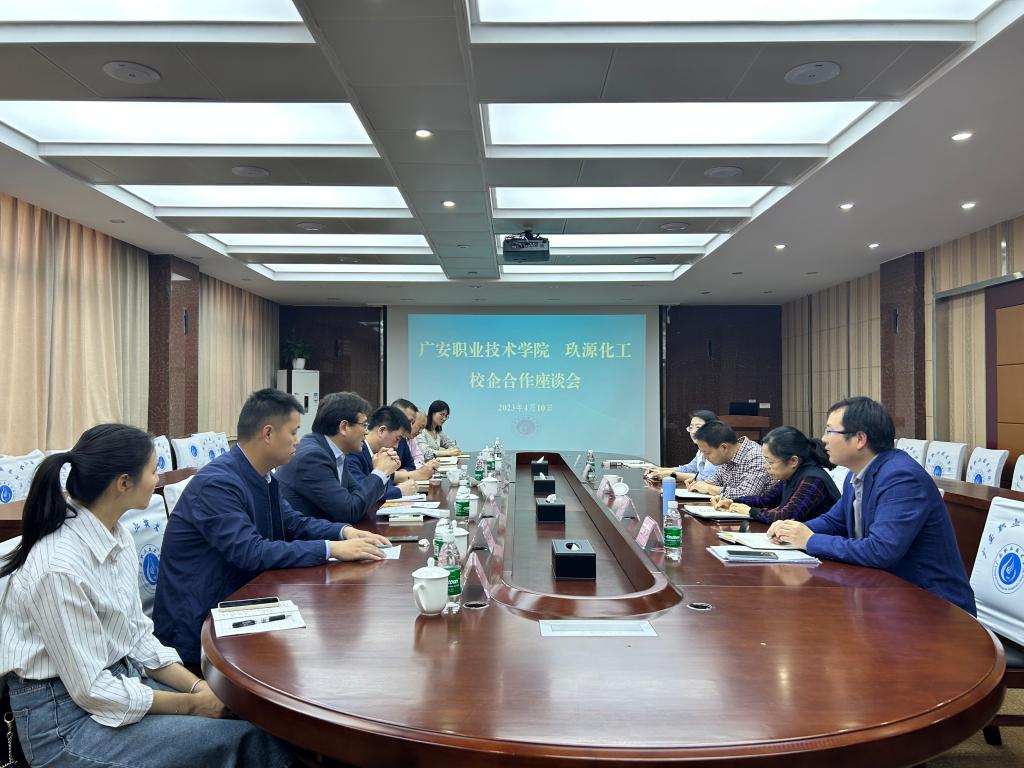 4月10日下午,广安玖源化工有限公司总经理何希甫一行3人来校与太阳集团tcy8722开展校企合作洽谈,广安经开区党工委委员、副主任张学秋,广安市经济和信息化局总经济师唐刚及相关科室负责人,学校党委委员、副校长袁驰及相关部门负责人参加了座谈会。