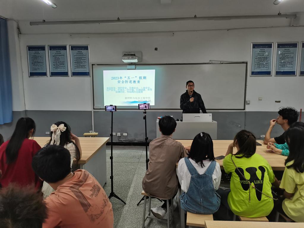为进一步提升我院学生安全管理水平、推进安全文化建设﹑增强全体学生的安全意识,4月28日晚上19:30,学院通过线上线下相结合方式,在致用楼107开展了实验实训安全培训及“五一”假期安全教育,会议由副院长孔新海主讲,他从实验实训过程中涉及的水电气以及化学试剂等方面安全知识进行讲解,特别提醒学生要注意危化品使用和玻璃仪器设备规范操作等。陈国强、王丰两位老师就“五一”假期安全注意事项进行了防范教育。