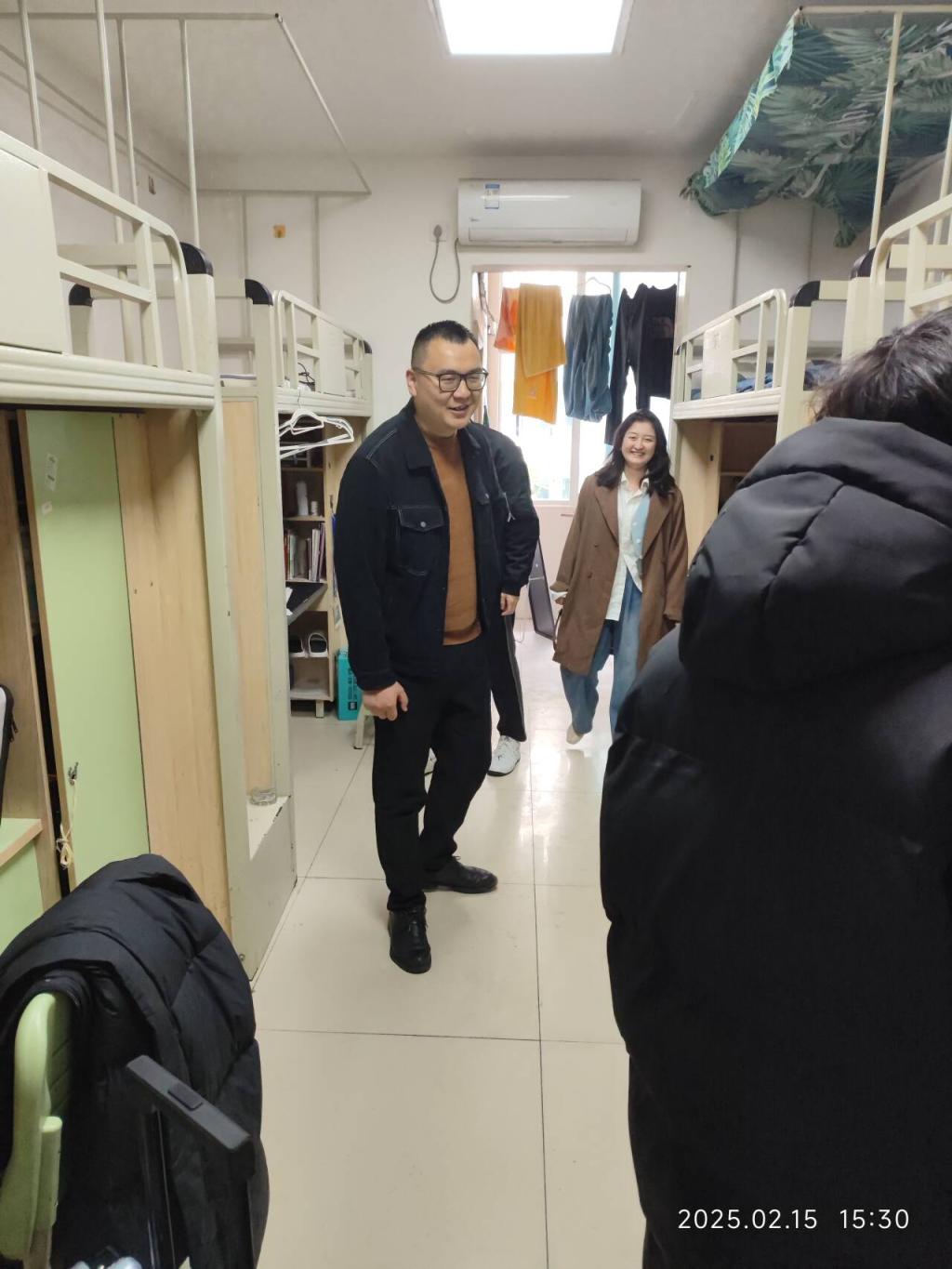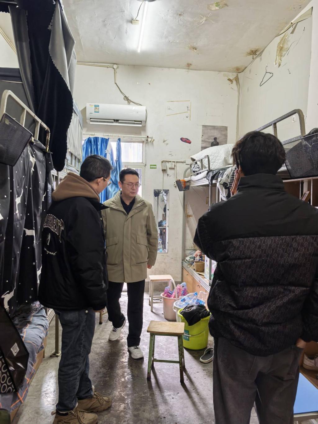 赵渊带队深入滨江校区男女生宿舍,重点检查宿舍的门窗、床铺、柜子等设备的使用情况,逐一排查违规电器使用、私拉电线等问题,并督促整改卫生死角。